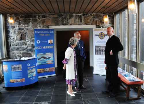 Stiftelsen av Bergens Svømme Club var med på å skape svømmehistorie. Det er blitt utgitt en egen jubileumsbok for anledningen. Fin og smakfull åpningsutsmykning var det også der gjestene ble tatt imot. Her ser du leder Kristian Arnesen som tar imot noen av de første gjestene.